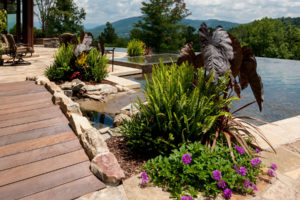 ACM Design Architecture & Interiors / Modern Rustic Mountain Outdoor Living / Bridge detail over creek that feeds into the pool